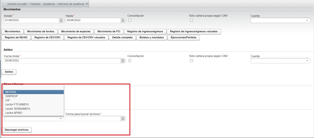 Asimismo, se incluirá el nuevo reporte OPERSECEXT dentro de los reportes que se importan en el backup del sistema. Los mismos seguirán disponibles en la pantalla “Informes de auditoría”, en la sección “Recuperar archivos” bajo la opción MERVAL y la fecha: