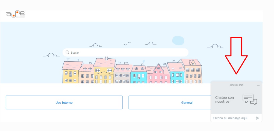 • Plataforma Zendesk: accediendo al link https://aune.zendesk.com/hc con el usuario y clave configurados al migrar a esta herramienta. Puede abrirse un chat presionando el botón situado en el margen inferior derecho como se ve en la siguiente imagen: