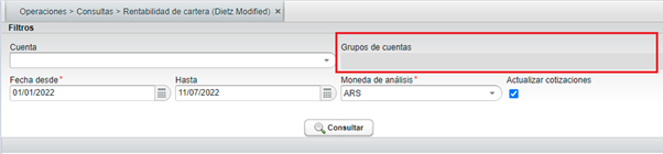 Se agrega la posibilidad de que el usuario pueda optar por consultar la rentabilidad de un grupo de cuentas en vez de una cuenta en particular, esto a través de la utilización del filtro “Grupo de cuentas”: