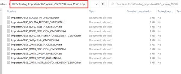 Desde dicha funcionalidad se descargará un archivo ZIP que contendrá, a su vez, los archivos TXT en otro ZIP agrupados por fecha y hora de ejecución del proceso de importación. Los TXTs estarán divididos según el tipo de información que se haya logueado en los mismos, de acuerdo con las diferentes situaciones que pueden presentarse. A modo de ejemplo: