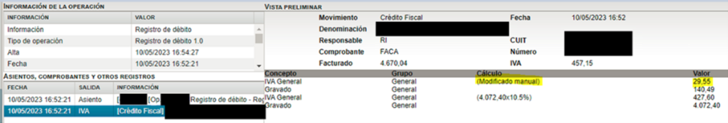 Se detalla además que se agrega una indicación, cuando al cargar una operación se modifica manualmente el importe del IVA en “Datos”, en los cálculos del apartado “IVA” aclara “Modificado manualmente” tal como se grafica a continuación: